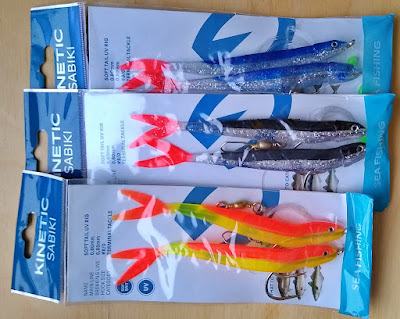 Med de två gul/orange gummifiskarna och 0,60 mm nylonlina knöt jag dels ett drop shot-tackel och dels ett tackel avsett att fiskas med ett sänke några decimeter framför betet. På båda tacklen är den ögla i vilket sänket ska fästas av klenare - 0,40 mm - lina för att öka chanserna att rädda tacklen om sänket skulle gå fast (men tillräckligt starkt för att inte ett 60 grams sänke ska få för sig att lossna vid utkast och fara iväg som en livsfarlig projektil).